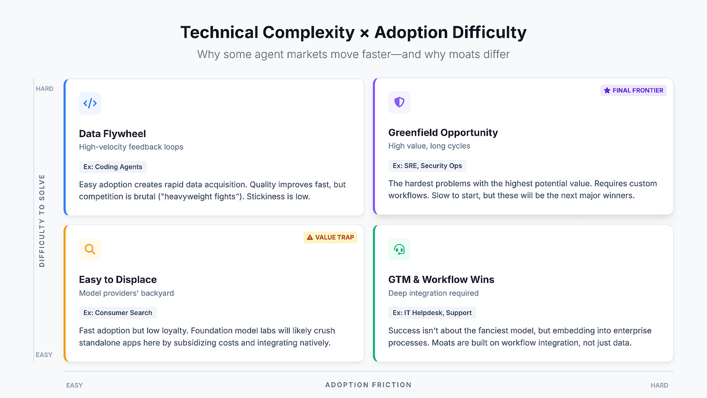 The data moat here is the most complex and potentially the most valuable. If you build expertise in one company’s workflows, that becomes very difficult to replicate – switching products would be akin to firing an experienced engineer and replacing them with a new person. There’s potentially an opportunity to build expertise in core capabilities (e.g., an SRE agent that’s an expert in AWS). However, this improvement cycle will be significantly slower than it was with coding agents because the quantity of data is lower and verifiability is less obvious.
